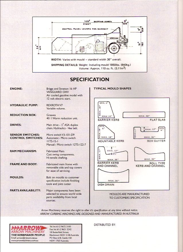 The moulds for the extruded concrete, engine, gearbox and ram operating mechanism are the same for all three models and are interchangeable.  The drive engine mentioned is a twin cylinder 16hp Briggs & Stratton 4 stroke petrol engine fitted with 12 volt electric start and charging system.