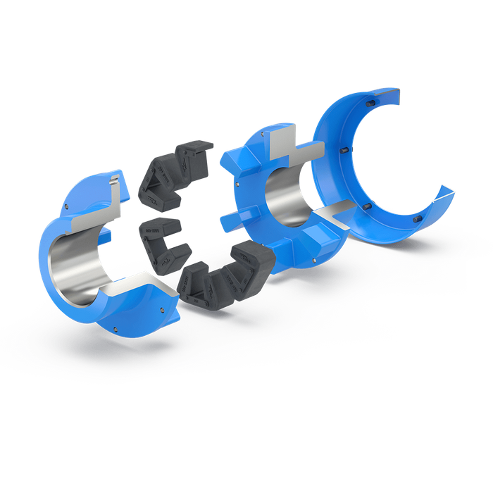 For sizes up to and including MMS 63 the coupling consists of a split toothed ring which has the single rubber dampers attached to an external belt. In addition 6 saddle elements are used each with two rubber dampers attached to an external belt.
