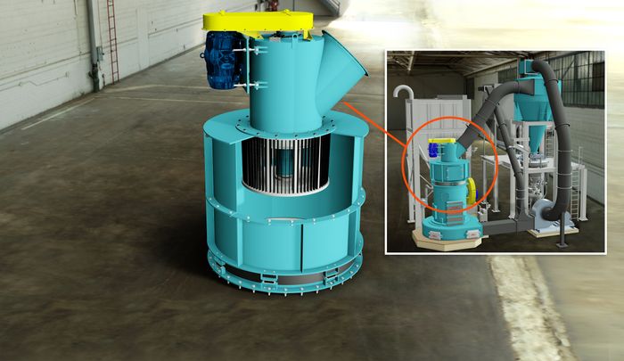 This dynamic classifying technology utilizes vertical oriented blades and a separator rotor to create a vortex, spinning the passing air and throwing coarse particles out to the sides of the mill, where they fall back into the grinding zone. Desired fine particles are carried out through the separator rotor,  and up to the cyclone or bag filter collector.